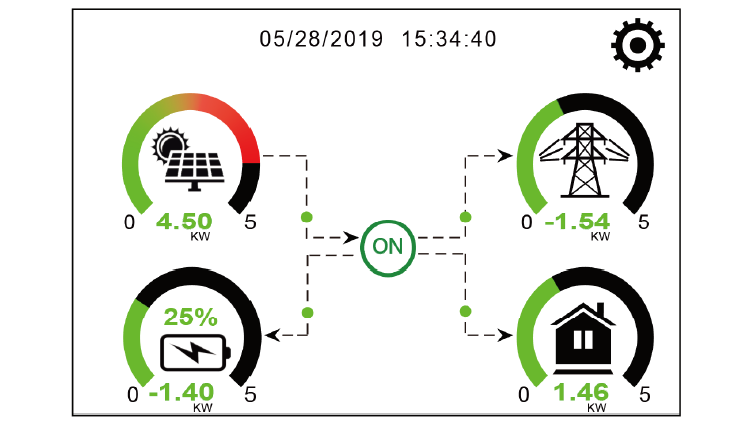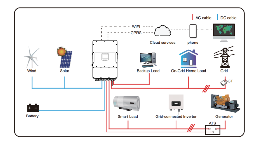 Acesta este un invertor multifuncțional, care combină funcțiile de invertor, încărcător solar și încărcător de baterie pentru a oferi suport de energie neîntreruptă. Afișajul său cu ecran tactil LCD cuprinzător oferă o funcționare configurabilă și cu acces ușor, cum ar fi încărcarea bateriei, încărcare CA/solară și tensiune de intrare acceptabilă pe baza diferitelor aplicații.